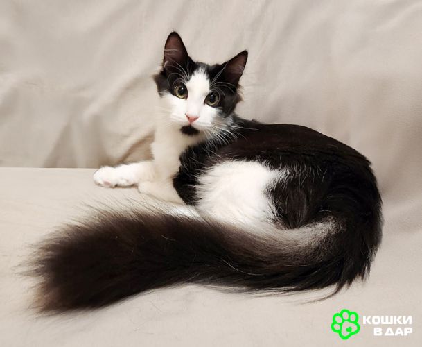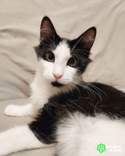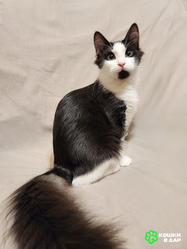 Тришка черно-белого окраса, который называется "маркиз", пушистый, очень смешной и трогательный, со слегка косящими глазками, очень ласковый, в общем, мечта, а не кот.