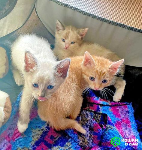Котятки — метисы тайской породы, уже прошли первоначальные обработки, клинически здоровы. Они ласковые, умненькие, игривые — настоящие котодети, готовые дарить тепло и радость каждый день